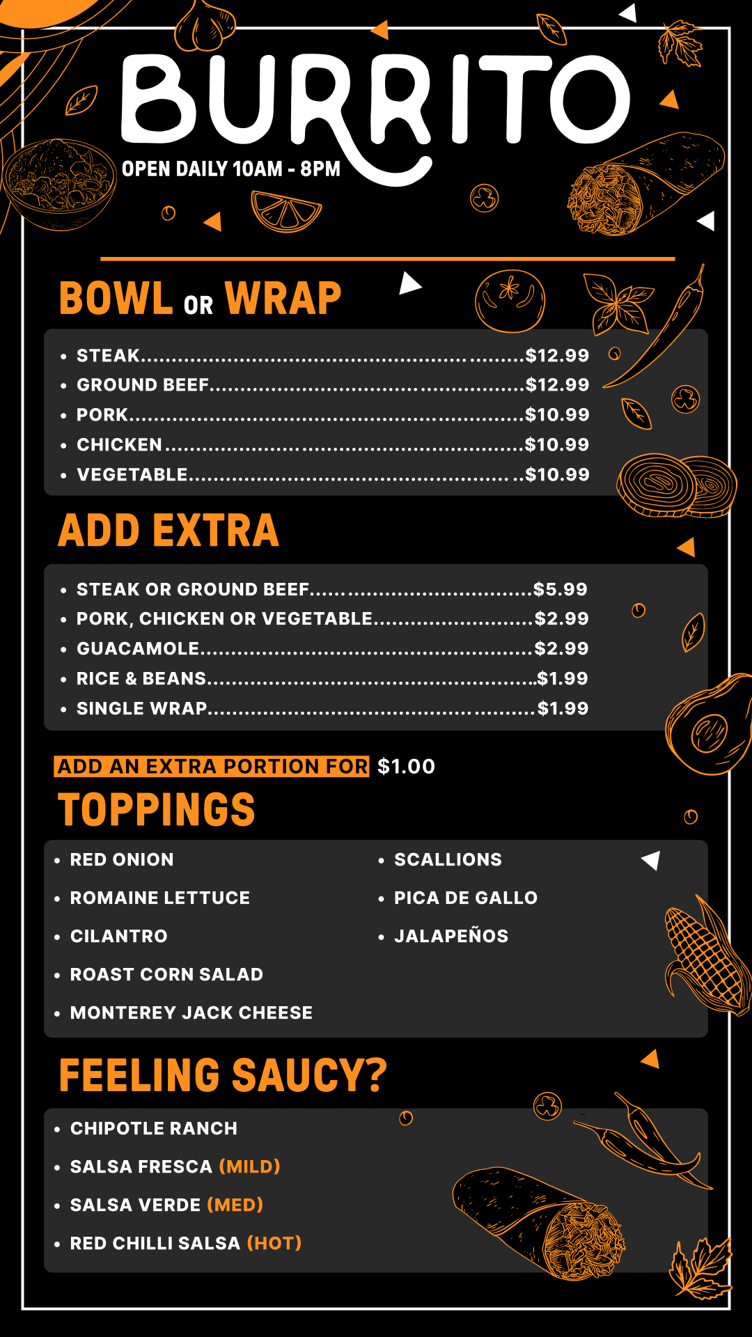 Customize your burrito or bowl with fresh proteins, crisp veggies, and bold sauces for authentic flavor and unbeatable value. Vegetarian options ensure there’s something delicious for everyone! From $10.99 you cant go wrong!